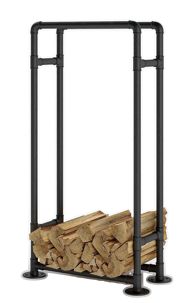 (Click on each item to order: Deer Head-Amazon$44, Firewood Rack-Amazon$138 and Waxed Canvas Tote-Amazon$20)