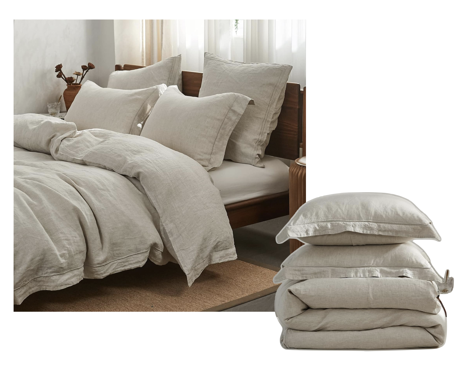 (Click on each item to order: Mattress Topper-Amazon$120, Flax Linen Duvet Cover Set-Amazon$147, Breathable Down Duvet-Amazon$299, Barefoot Dreams Cozy Throw-Amazon$129, Linen Throw Pillow Covers-Amazon$17, Down Inserts-Amazon$30 and Saint Anthony Candle-Amazon$75)